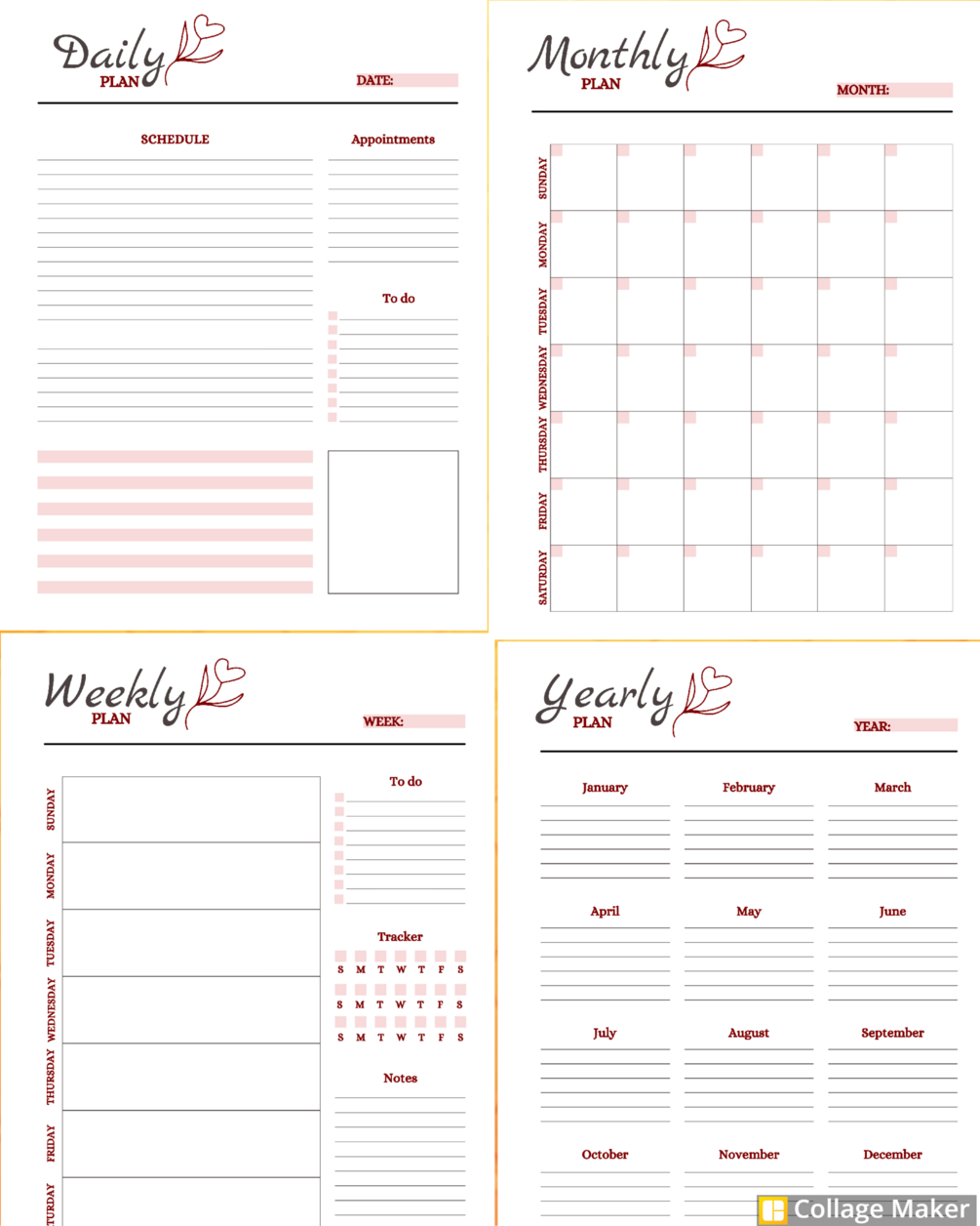 4 Printable pages (daily, weekly, monthly & yearly)