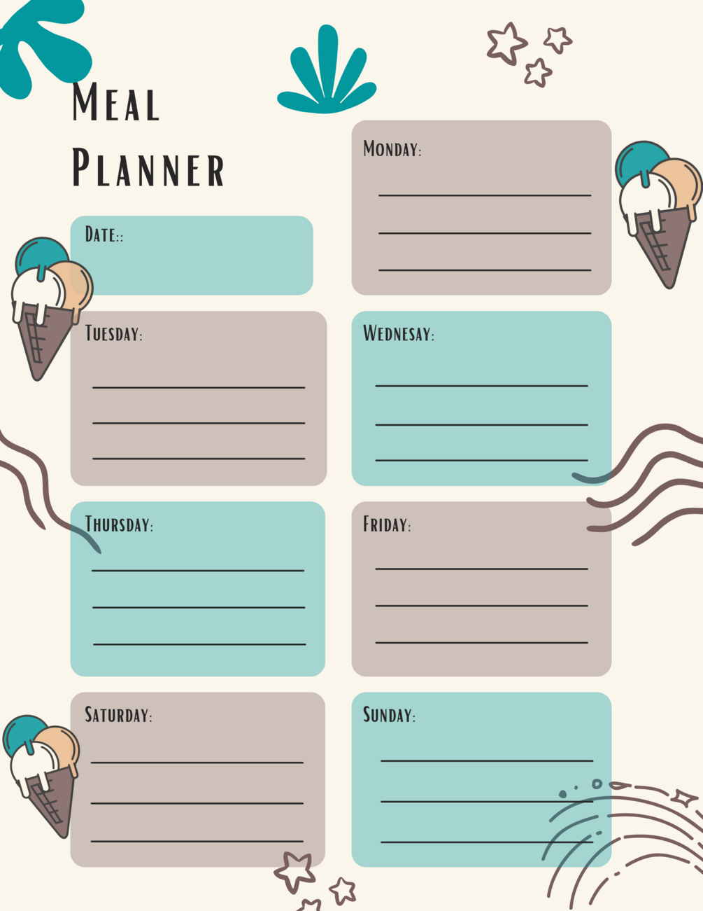 Ice cream Planner Pack includes Daily, Weekly, Monthly Planners, Meal Plan & Grocery Lists (6 pages total)