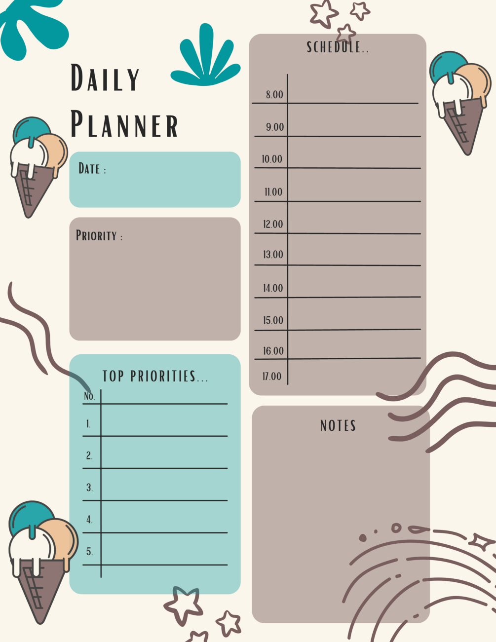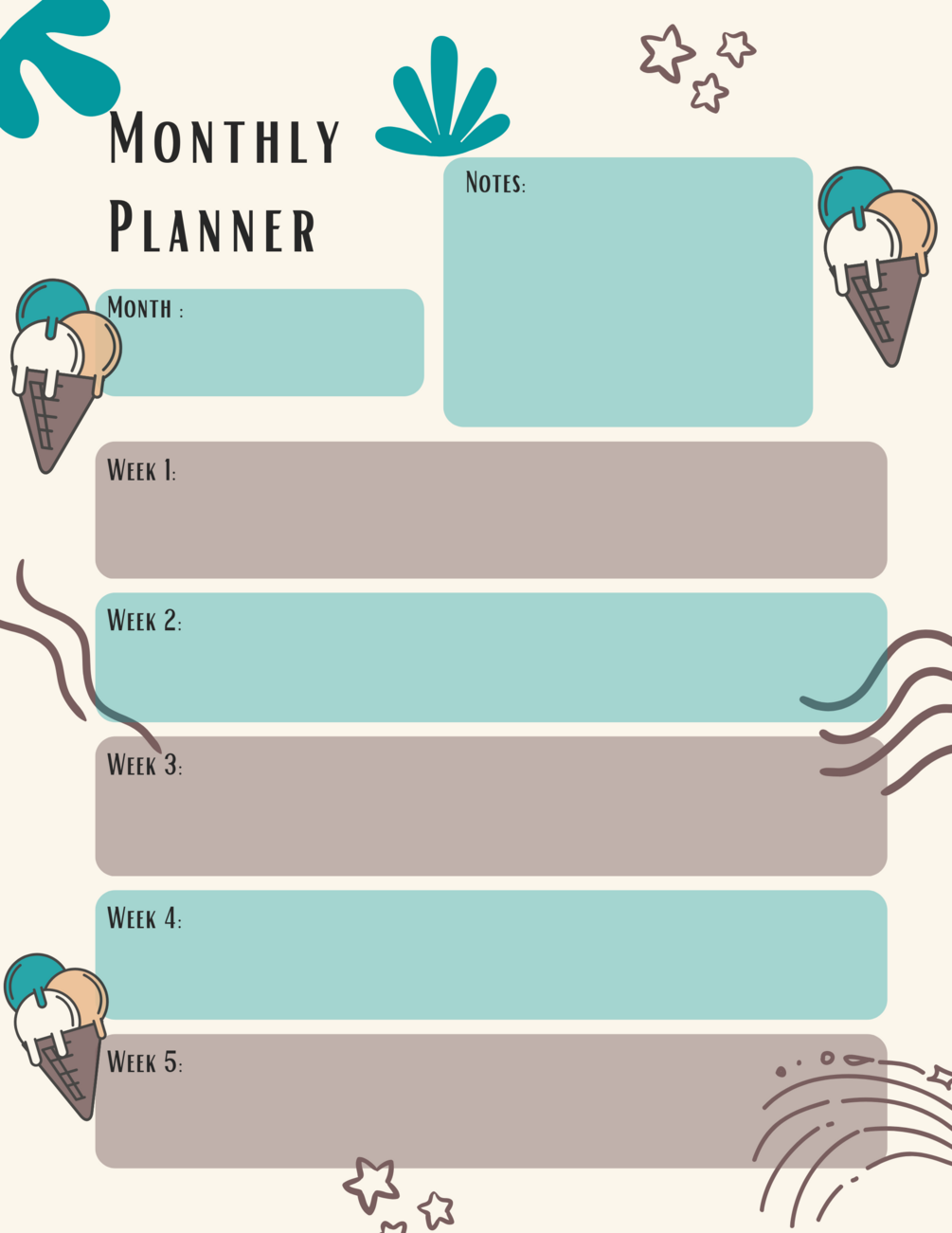 Ice cream Planner Pack includes Daily, Weekly, Monthly Planners, Meal Plan & Grocery Lists (6 pages total)
