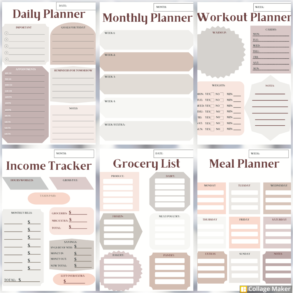 This pack includes 10 printable pages: -Daily Planner -Weekly Planner -2 Monthly Planner Pages -Income Tracker -Workout Tracker -2 Grocery Lists -Meal Planner -Calendar Events Planner